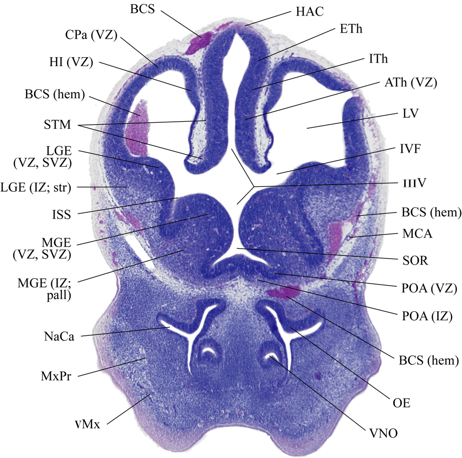 Coronal sections of gestational day (GD) 12 mouse heads, every 5th. section, stained with a hematoxylin and eosin (H & E).